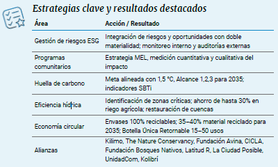 Nuestra estrategia de agua tiene tres pilares: uso racional en operaciones, acceso a agua potable y conservación de ecosistemas. Identificamos zonas de estrés hídrico con evaluaciones técnicas y diseñamos intervenciones locales dentro de “Aliados por el Agua”, con Kilimo, The Nature Conservancy, Fundación Avina, CICLA y Fundación Bosques Nativos. Aplicamos IA y datos satelitales para optimizar riego y restaurar cuencas, logrando ahorros de agua de hasta 30% en varias provincias y mejorando la calidad hídrica en ecosistemas clave.