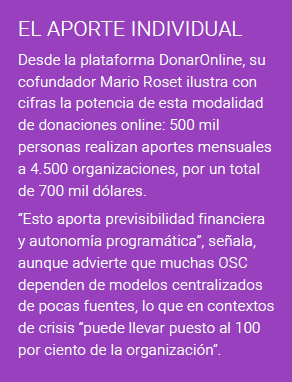 En tanto, desde Sociedad Civil en Red, Guilisasti plantea que, hoy por hoy, “la principal fuente de financiamiento de las OSC son los donantes individuales”. Sin embargo, señala que el problema que presenta esa modalidad es la dificultad para actualizar los aportes en función de la inflación: “Es muy difícil pedirle a los donantes individuales que aumenten su aporte